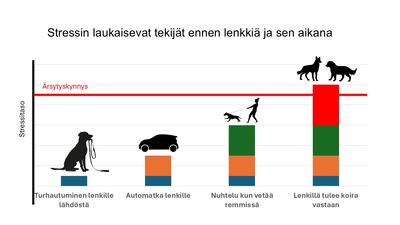 Koira kohtaa stressiä joka päivä, ihan normi arjessa kotona ja lenkeillä, kuin myös treenitilanteessa. Stressiä lisäävien tekijöiden ei tarvitse välttämättä olla kovin dramaattisia kuten pelästyminen; pelkästään uuden oppiminen ja innostuminenkin stressaa koiraa. Stressiä siis kertyy koko ajan, ja pienet stressitilanteet johtavat suureen stressiin ja lopulta koiralla menee kuppi nurin.